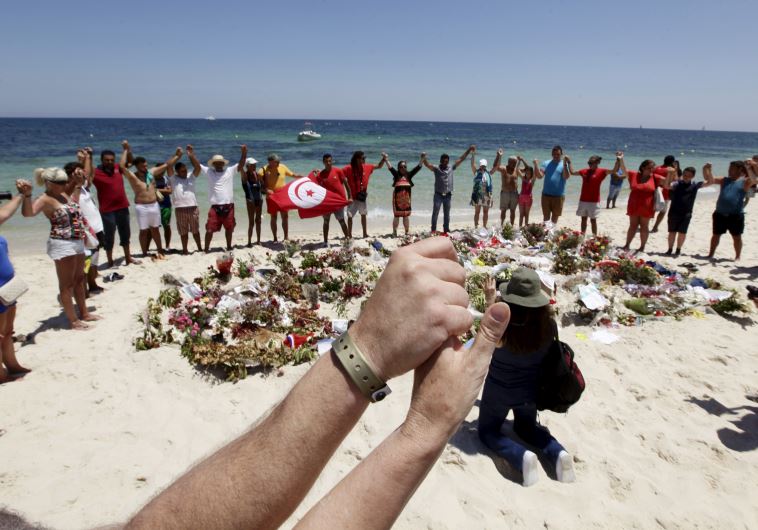 People join hands as they observe a minute’s silence in memory of those killed in a recent attack by an Islamist gunman, at a beach in Sousse, Tunisia July 3, 2015.. (photo credit:REUTERS/ANIS MILI)