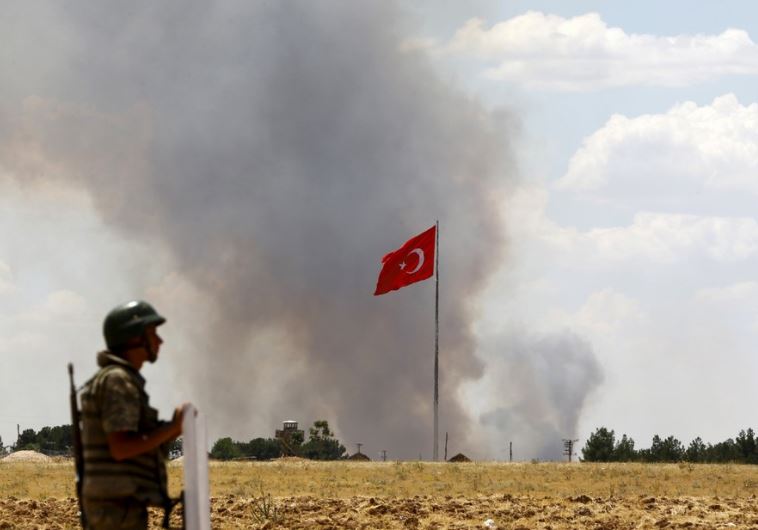 A Turkish soldier stands guard while smoke rises in the Syrian town of Kobani as it is seen from the Turkish border town of Suruc. (photo credit:REUTERS)