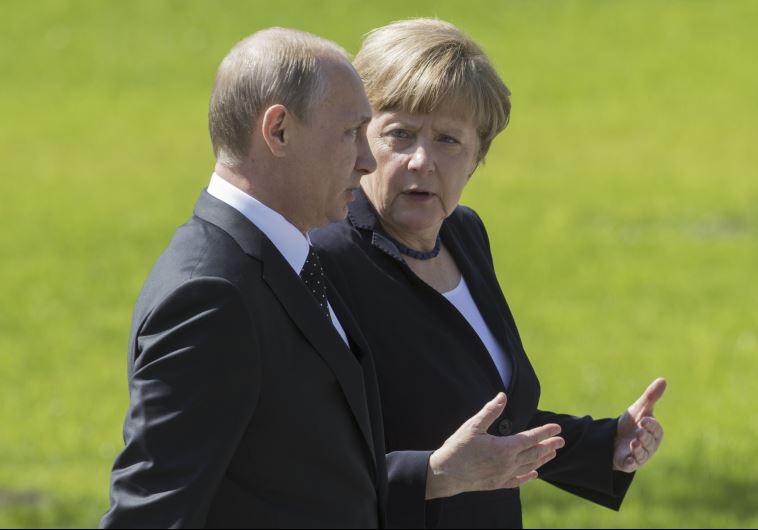 Russian President Vladimir Putin (L) listens to German Chancellor Angela Merkel as they attend a wreath-laying ceremony at the Tomb of the Unknown Soldier in Moscow. (photo credit:REUTERS)