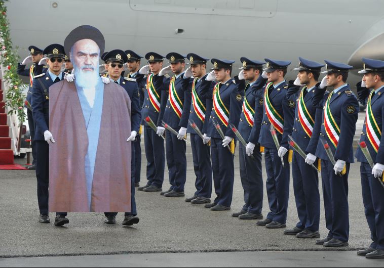 Members of the Iranian air force re-enact the scene of founder of the Islamic Republic Ayatollah Ruhollah Khomeini’s arrival to Iran in 1979 at Merhrabad airport. (photo credit:REUTERS)