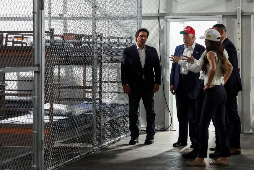 President Donald Trump, Florida Gov. Ron DeSantis and Homeland Security Secretary Kristi Noem visit a temporary migrant detention center informally known as “Alligator Alcatraz” in Ochopee, Florida, on July 1, 2025.