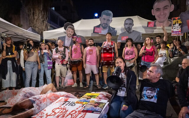 As protesters chanted for a hostage deal, four activists dressed in Greco-Roman garb coated themselves in fake blood and lay on the street.