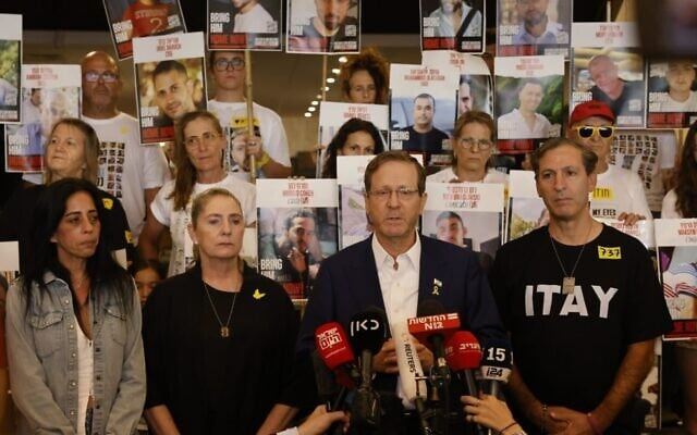 Hours ahead of the expected hostage release, President Isaac Herzog told a crowd gathered at Tel Aviv’s Hostages Square on Sunday afternoon that the ceasefire agreement was “painful” in part, but represented “a historic moment” that could reshape the Middle East.