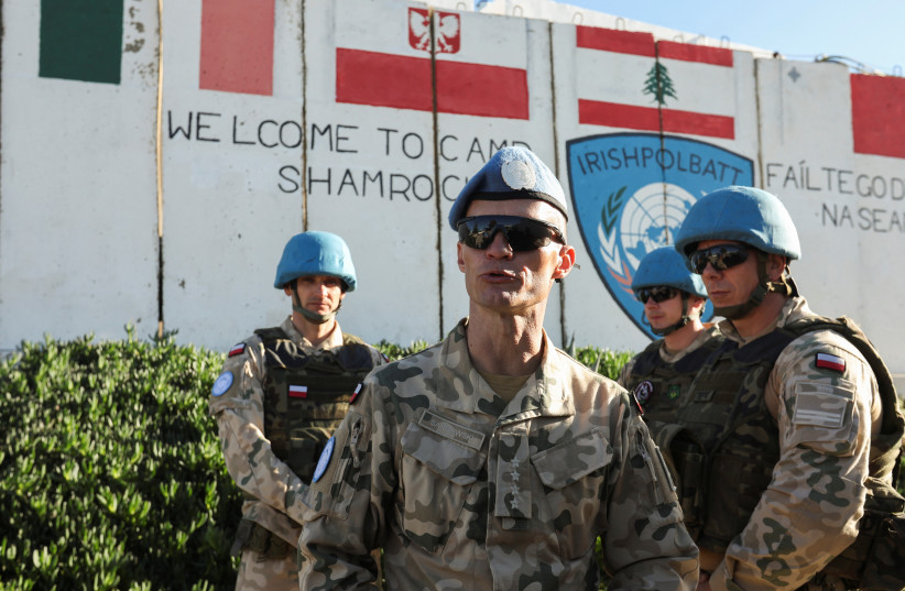 Polish peacekeepers stand together during Reuters’ visit at Camp Shamrock where Irish and Polish peacekeepers of the United Nations Interim Force in Lebanon (UNIFIL) are stationed near Maroun al-Ras village close to the Lebanese-Israeli border, in southern Lebanon November 29, 2023. (credit: AZIZ TAHER/REUTERS)