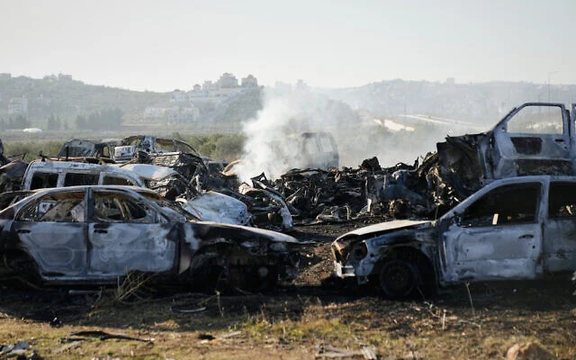 Smoke rises from scorched cars in a scrapyard that Israeli settlers set ablaze the night before, in the town of Hawara near the West Bank city of Nablus, November 21, 2025. (AP Photo/Nasser Nasser)