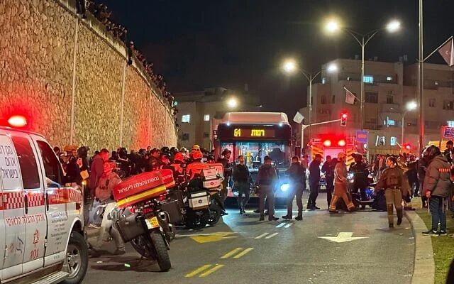 A Times of Israel correspondent witnessed emergency responders attempting to extricate a person from under the bus on Ohel Yehoshua Street.