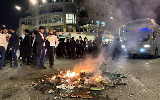 The rally, which was the initiative of a group of leading ultra-Orthodox rabbis, opened with fiery speeches and descended into chaos as the evening wore on, with protesters setting several fires in the middle of the neighborhood’s Yirmiyahu Street, and blocking the intersection with Shamgar Street.