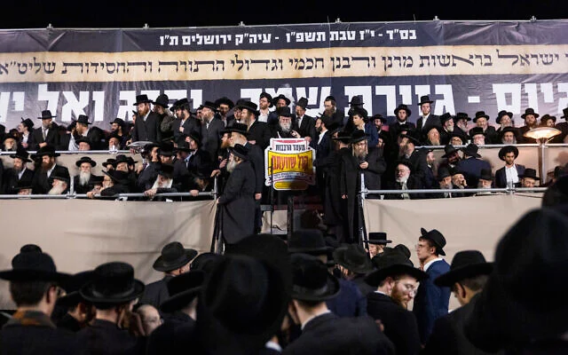 Dozens of rabbis sat on an elevated dais before the crowd, gathered under a giant banner that decried the bill as a “decree of destruction” and stated, “Better to die than transgress.”